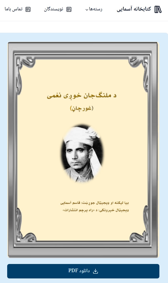 ادبي آثار د یوه ملت د فکري او فرهنګي ژوند ژوندي یادګارونه دي. د وتلو او نامتو شاعرانو کلام نه یوازې د خپل وخت د احساساتو، هیلو او فکرونو هنداره وي، بلکې د راتلونکو نسلونو لپاره هم د الهام سرچینه ګرځي. له همدې امله د داسې آثارو ساتنه او خوندي کول د فرهنګي مسئولیت تر اطلاعت بیشتر دربارهد ملنگ جان خوږی نغمی (غورچاڼ) شاعر: محمدامین «ملنگ جان» باز تایپ و تدوین دیجیتال : رفیق قاسم آسمایی باز پخش : انتشارات راه پرچم[…]