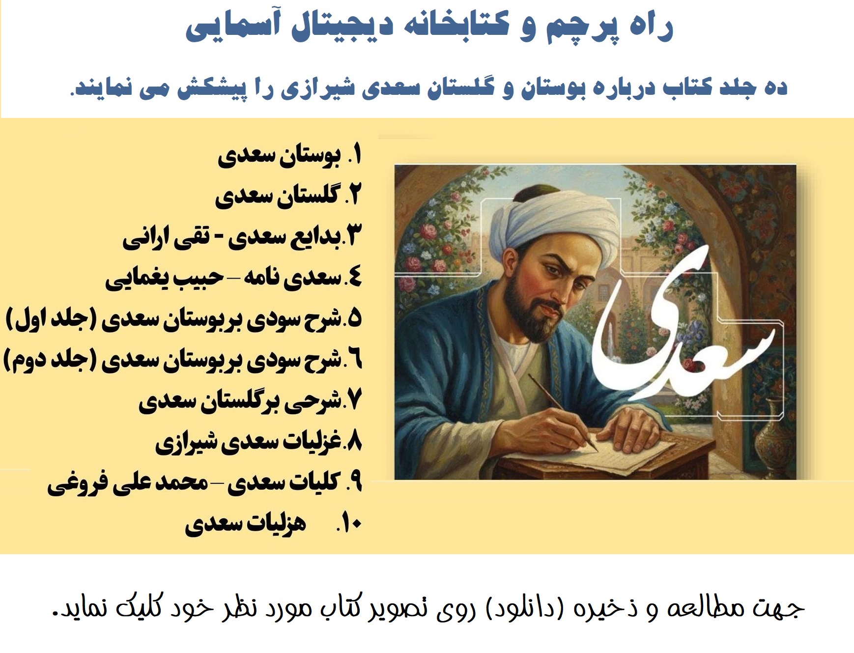1. بدایع سعدی – تقی ارانیhttps://aasmai-book.com/books/122652. بوستان سعدیhttps://aasmai-book.com/books/122683. سعدی نامه – حبیب یغماییhttps://aasmai-book.com/books/122734. شرح سودی بر بوستان سعدی (جلد اول)https://aasmai-book.com/books/122835. شرح سودی بر بوستان سعدی (جلد دوم)https://aasmai-book.com/books/122826. شرحی بر گلستان سعدیhttps://aasmai-book.com/books/122797. غزلیات سعدی شیرازیhttps://aasmai-book.com/books/122788. کلیات سعدی – محمد علی فروغیhttps://aasmai-book.com/books/122779. گلستان سعدیhttps://aasmai-book.com/books/1227410. هزلیات سعدیhttps://aasmai-book.com/books/12332 روز جهانی کتاب، به صاحبان قلم و کتاب دوستان اطلاعت بیشتر دربارهده جلد کتاب درباره بوستان و گلستان سعدی تهیه و ترتیب : رفیق قاسم آسمایی Saadi Shirazi’s Bostan and Golestan[…]