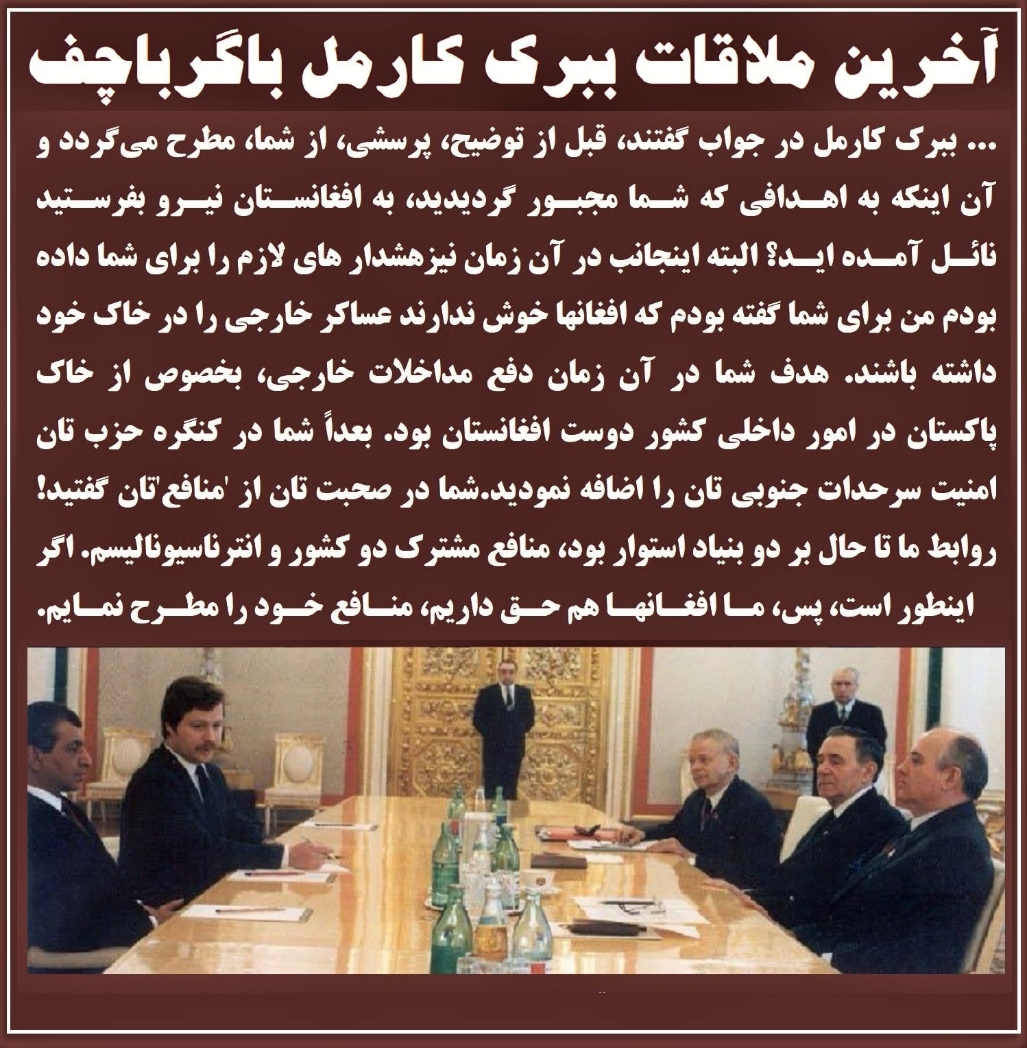 آیینهٔ تاریخ وبازتاب حقیقت ،بازدایش ابر پاره ها وغبار های توهم انگیز, اصلی ترین تصویر پردرخشش و ماندگار تاریخی رابامخالفت فقید ببرک کارمل با اعزام نیرو های شوروی در افغانستان به نمایش میگذارد.