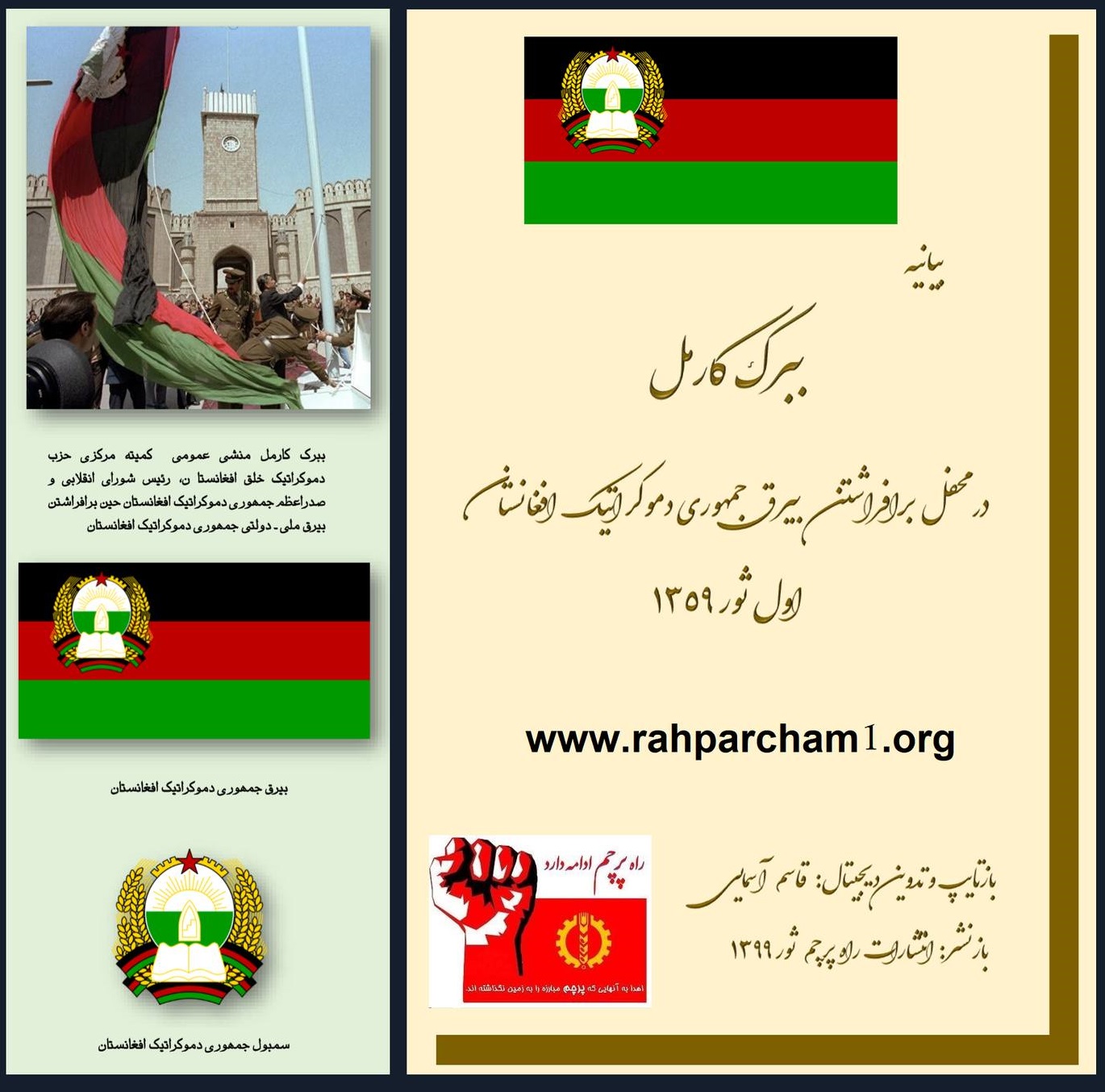 قابل یادآوری است که گرداننده های راه پرچم با تمام نیرو و درک مسولیت تا حال سعی نموده اند هرچه بیشتر در این زمینه فعال و موثرکار نمایند . باید گفت درحالیکه این همه دستاورد نتیجه کار مشترک همه ما و شماست جا دارد بخصوص از زحمات شباروزی رفقا هر یک رفیق قاسم آسمایی،رفیق انجینر عمر فیض و رفیق عارف عرفان از نام شما و از نام گرداننده های راه پرچم اظهار سپاس و امتنان نمایم و موفقیت های بیشتر شان را در این امرشریفانه در مسیر تاریخ سیاسی کشور ما آرزو نماییم.راه پرچمبیشتر در