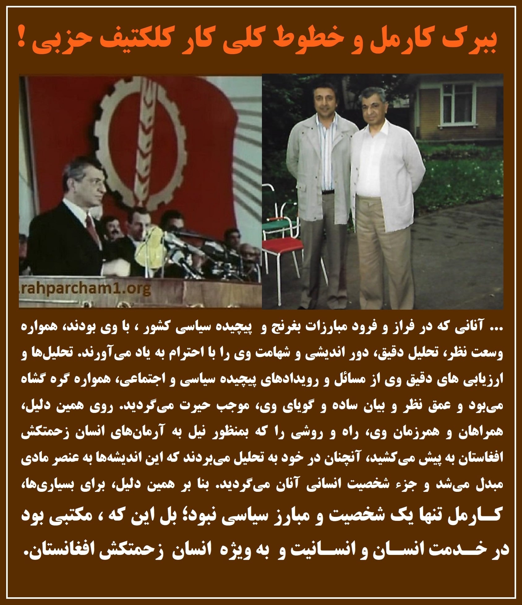 این حزب ما ( ح.د.خ.ا) تحت رهبری داهیانه رفیق ببرک کارمل بود که با انحرافات راست و چپ دست و پنجه نرم نمود و مبرا از هر نوع سازش و معامله گری و با در نظر داشت اصل اصول مترقی و در دفاع از منافع زحمتکشان به شعارها, بیانیه های خود پابند ماند و عمل نمود.