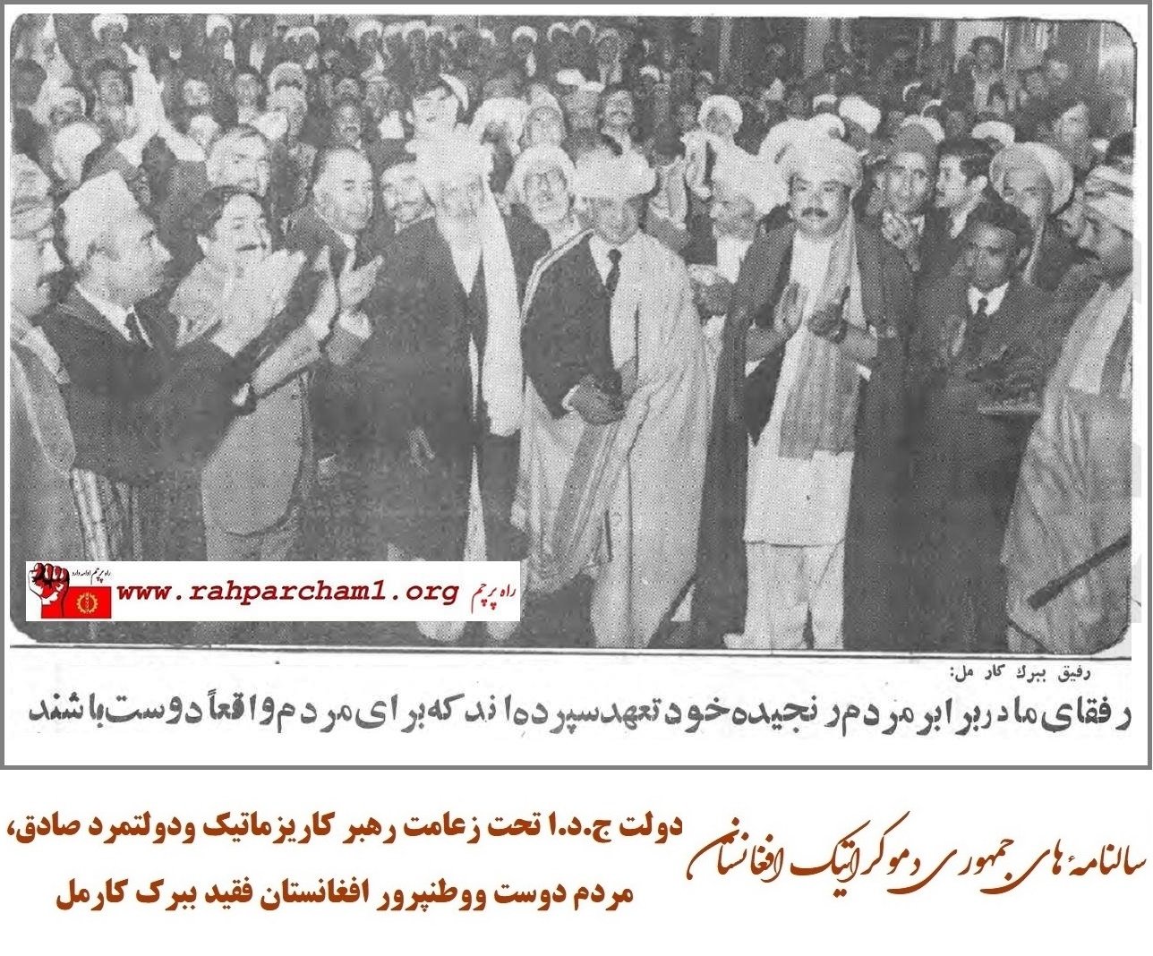 ح.د.خ.ا و رهبری داهیانه رفیق ببرک کارمل و سایر رفقای کادر رهبری یگانه حزب سراسری در کشور بود که بدون کوچکترین تبعیض و امتیاز در اندکترین زمان در قلوب هزاران انسان این وطن اعم از معصلان, استادان دانشگاه ها و مکاتب, کارگران, دهقانان, پیشاوران و کسبه کاران, علما و دانشمندان, مردان و زنان, جوانان, با سواد و بیسواد, افسران و سر بازان قواع مسلح کشور و در قلوب و اذهان پشتون, تاجک, ازبک, هزاره, ایماق, پشه ئی نورستانی و … سنی و اهل تشیع و اهل هنود جای گرفت, ریشه دوانید و همه به یک صدا از اهداف و آرمانهای سترگ (به خاطر رنجهای بیکران مردم افغانستان ) دفاع و پشتیبانی نمودند.