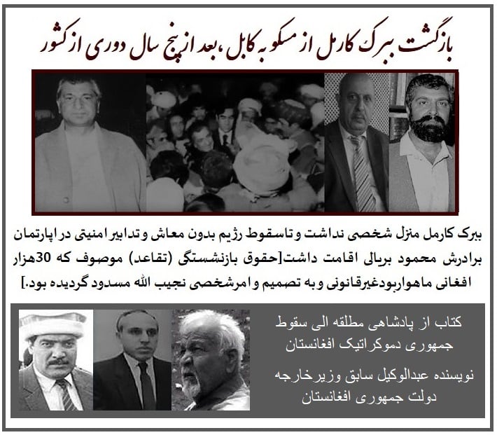 عبد الوکیل در کتاب خویش درین بحث ادامه داده خاطرنشان میدارد:همچنان وقتی بسیاری ها از ببرک کارمل پرسش بعمل می آورند که آیا خودت از اتحاد شوروی دعوت بعمل آوردید تابه افغانستان عساکر شان را بفرستند؟،وی در جواب میگفت : “ما آنها را دعوت نکردیم که به افغانستان بیایند،بل آنها زمانی که در تبعید بودیم از ما دعوت بعمل آوردند که به افغانستان برویم”(*4).