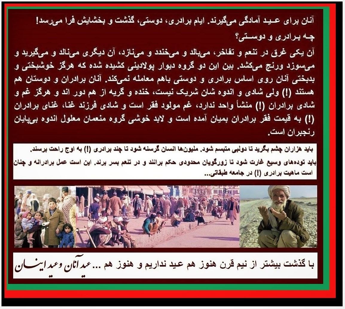 شرم باد آنانی راكه با زهم ﻓﺮیبکارانه ﻭ ﻛﺎﺫﺑﺎﻧﻪ، لاف از«دینداری»، «ایمانداری»، «مسلمانی» و«ﺟﻬﺎﺩ» و مردم سالاری (!) ﻭ ﻋﺪﺍﻟﺖ (!)… ﺳﺨﻦ ﻣﯽ ﮔﻮﯾﻨﺪ وبرای دوام غارت و ثروت اندوزی، جبرن و قهرن، بر گرده های مردم فقر زده و بی خانمان سوار و بالای آنان بی شرمانه حكومت میکنند!