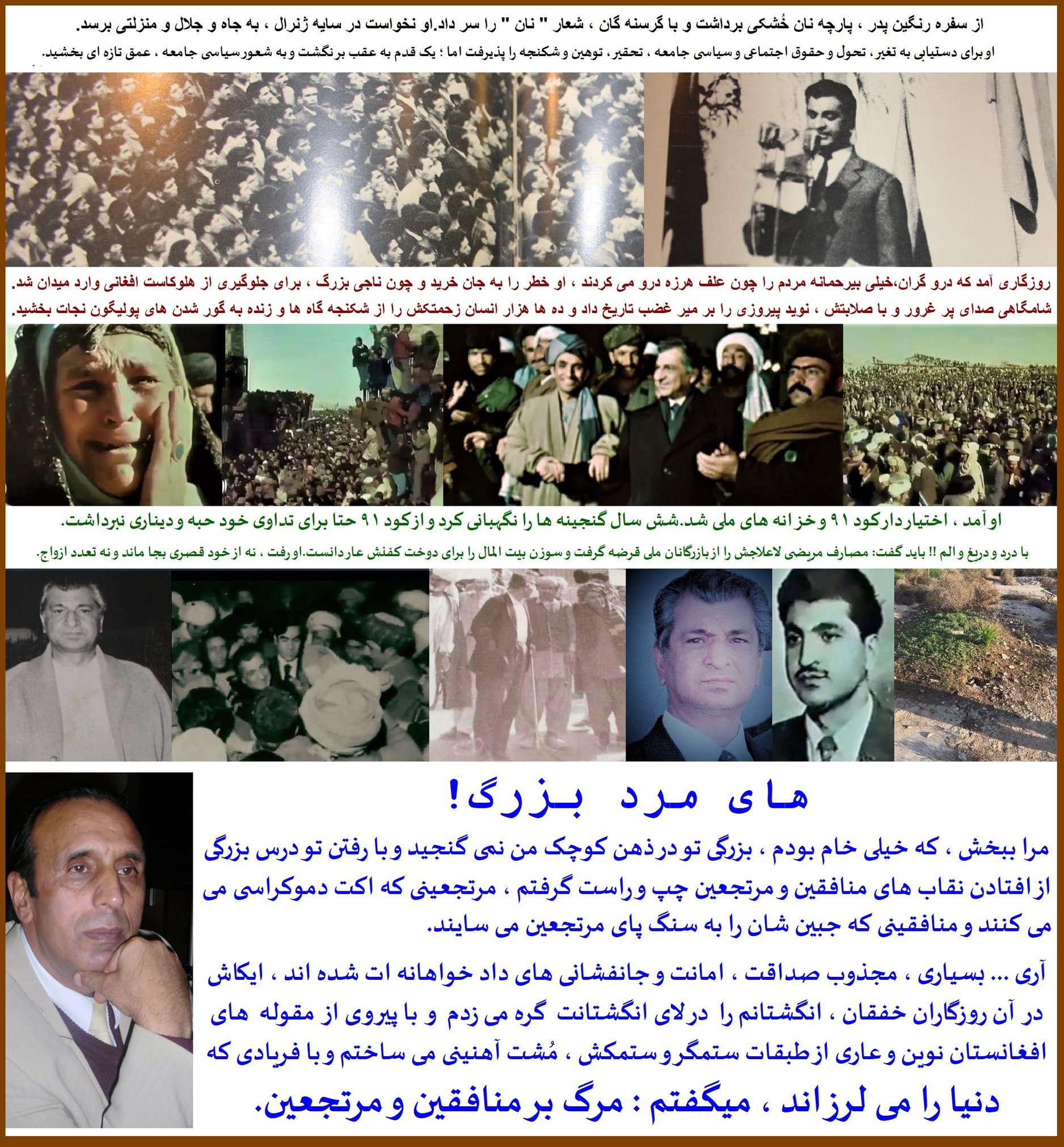 تعداد اکثریت به این باوریم که با در نظر داشت اوضاع و شرایط ( همان شرایط عینی و ذهنی ) و نیز ادامه تشدید جنگ و خونریزی, ویرانی و بربادی وطن, تهدید استقلال و تمامیت ارضی این کشور توسط بیگانگان به خصوص پاکستان و ایران در تبانی و توطه های جهانی و نیز ده ها پرابلم حیاتی دیگر تاریخ یکبار دیگر مسؤلسیتهای بس سترگ, سنگین, حیاتی و سر نوشت ساز را متوجه نیروهای وطن پرست و ترقی خواه گذاشته و تمامی ما را به دفاع و کمک میطلبد ( میگویم که سکوت را باید شکست )