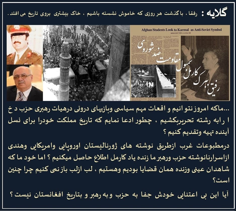 اینجا دیدگاه بعضی عزیزان بیخبر که خیر با خبرانی را میخوانم که آن همه حادثه را طوری فکر میکنند ویا وانمود میکنند که فقط برای تبدیلی مقام و شخصیت زنده یاد رفیق کارمل بود.