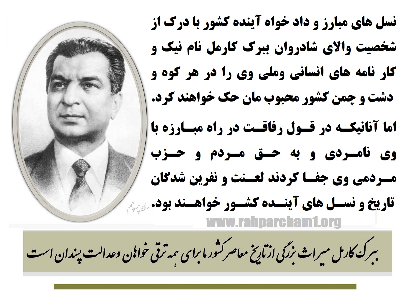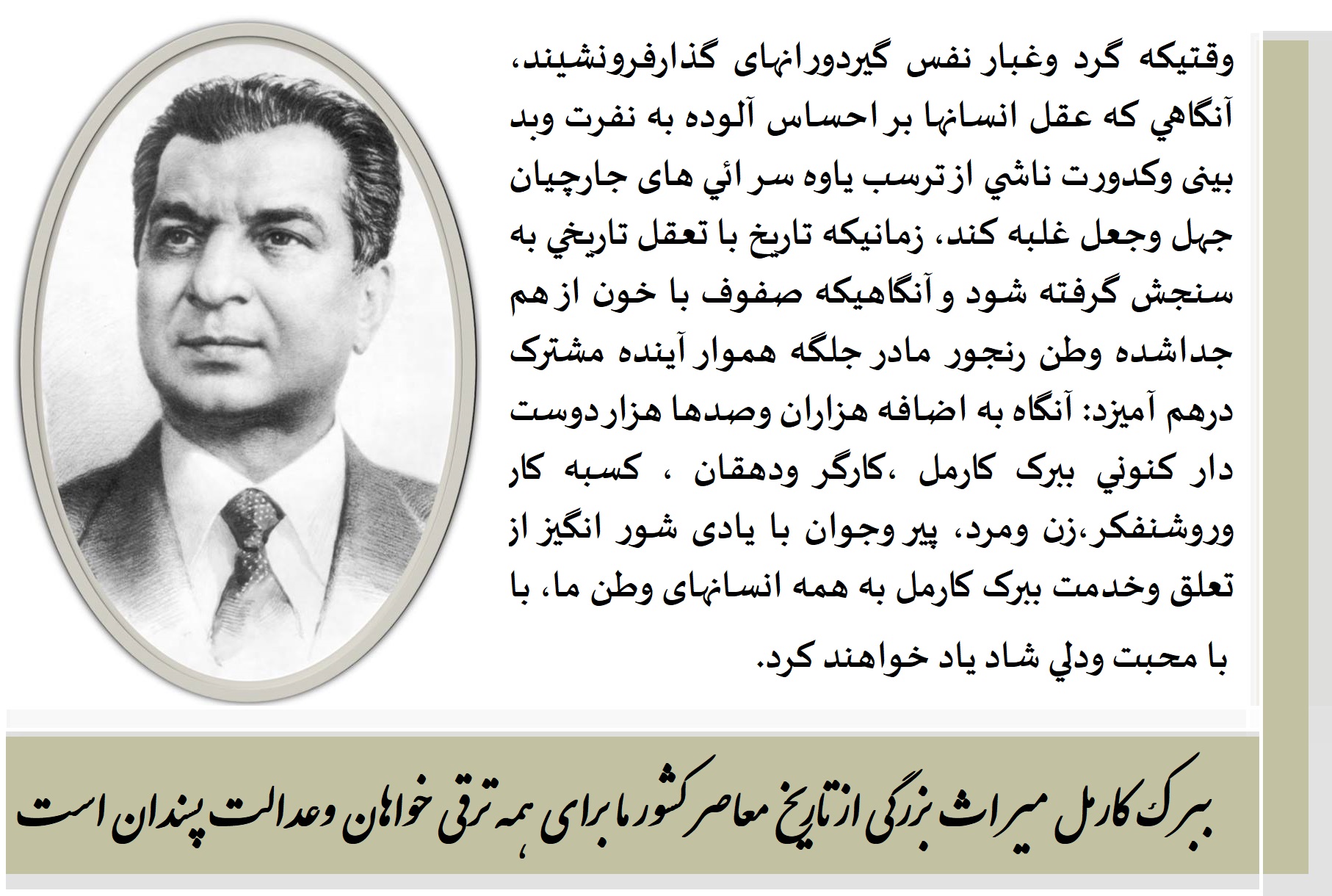 وقتيکه گرد وغبار نفس گيردورانهای گذارفرونشيند،آنگاهي که عقل انسانها بر احساس آلوده به نفرت وبد بينی وکدورت ناشي از ترسب ياوه سرائي های جارچيان جهل وجعل غلبه کند، زمانيکه تاريخ با تعقل تاريخي به سنجش گرفته شود وآنگاهيکه صفوف با خون از هم جداشده وطن رنجور مادر جلگه هموار آينده مشترک درهم آميزد: آنگاه به اضافه هزاران وصدها هزار دوست دار کنوني ببرک کارمل ،کارگر ودهقان ، کسبه کار وروشنفکر،زن ومرد، پير وجوان با يادی شور انگيز از تعلق وخدمت ببرک کارمل به همه انسانهای وطن ما، با محبت ودلي شاد ياد خواهند کرد.