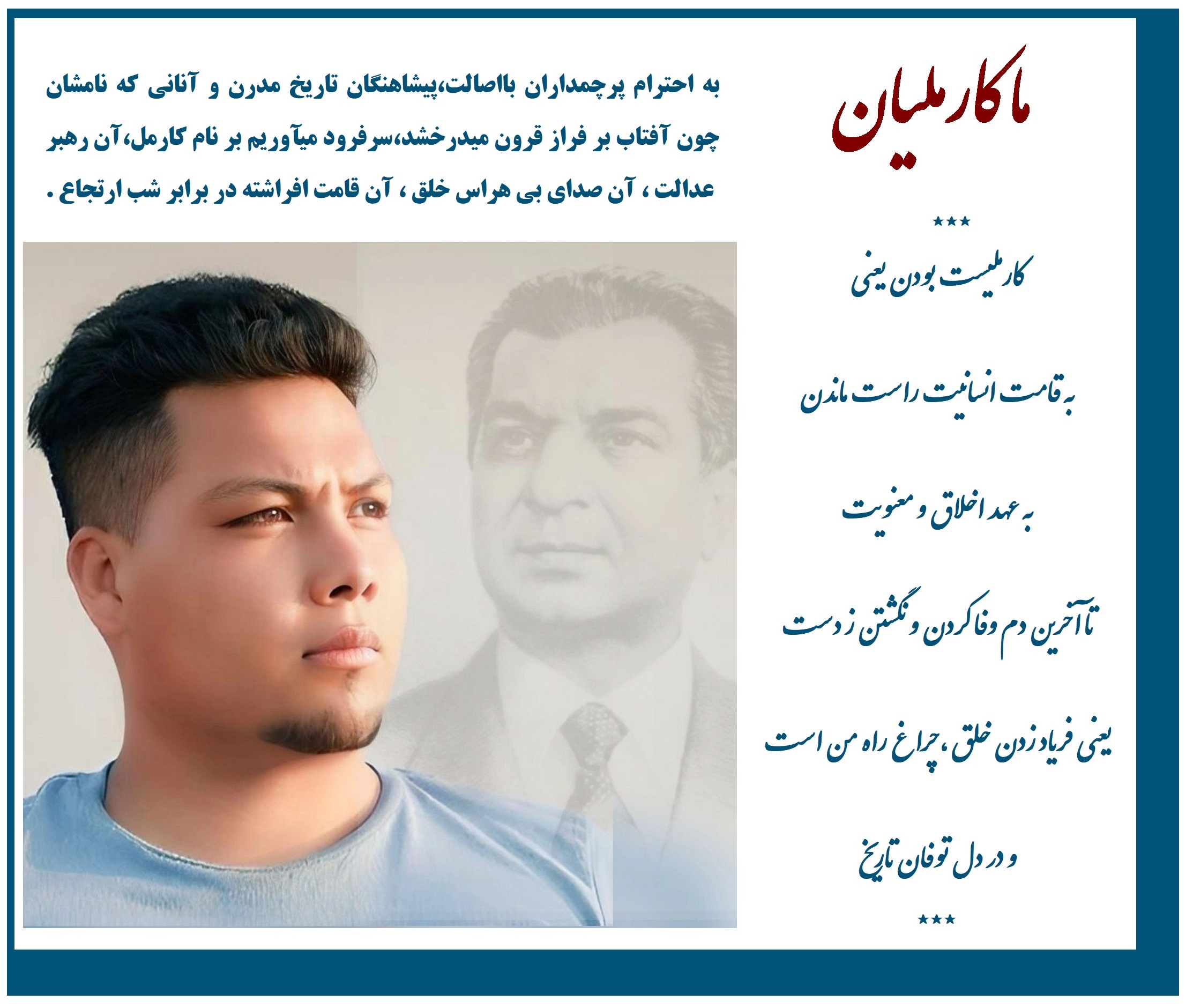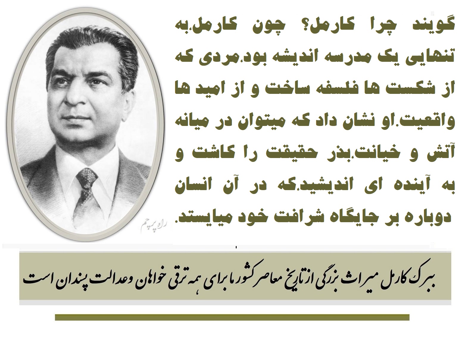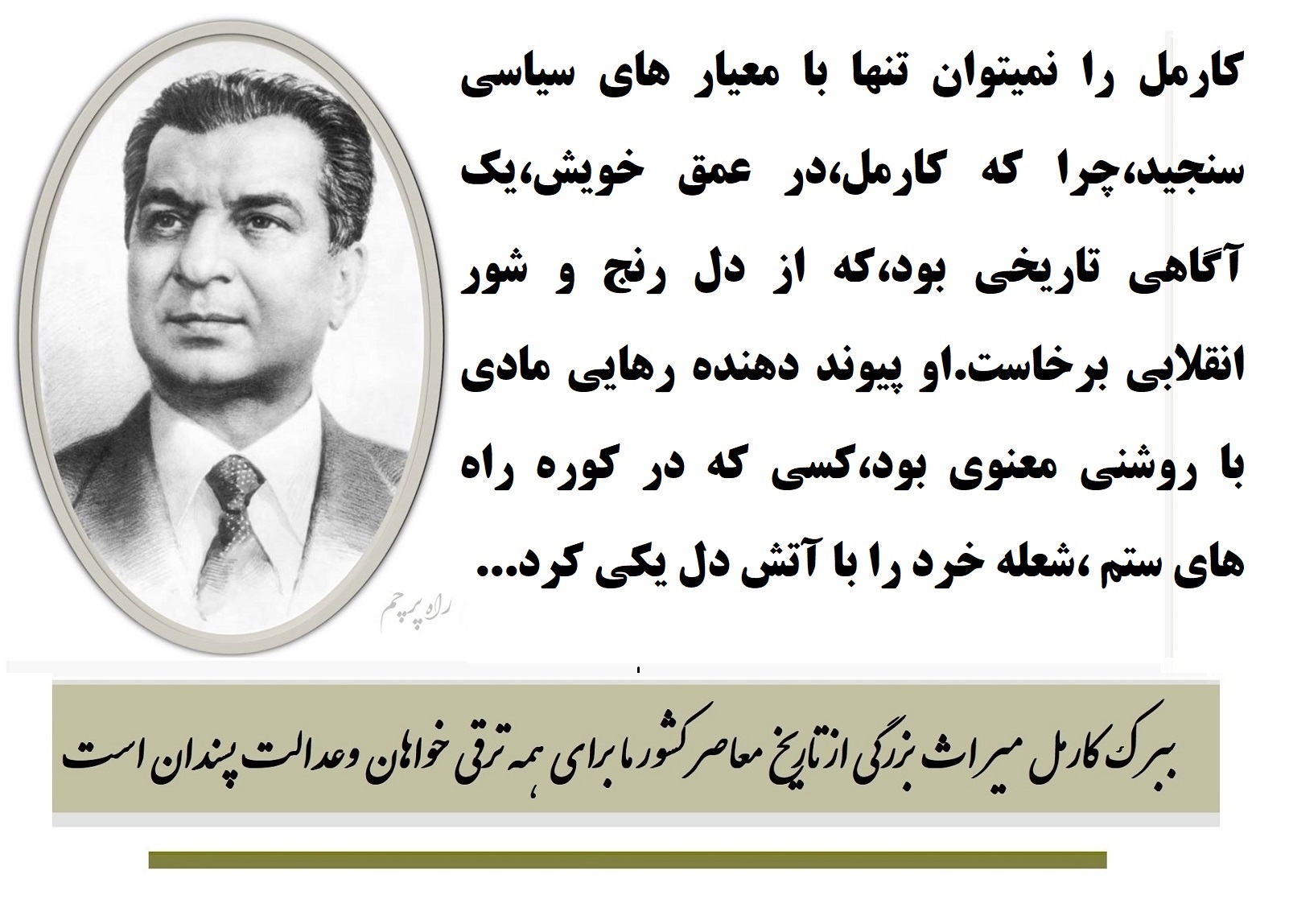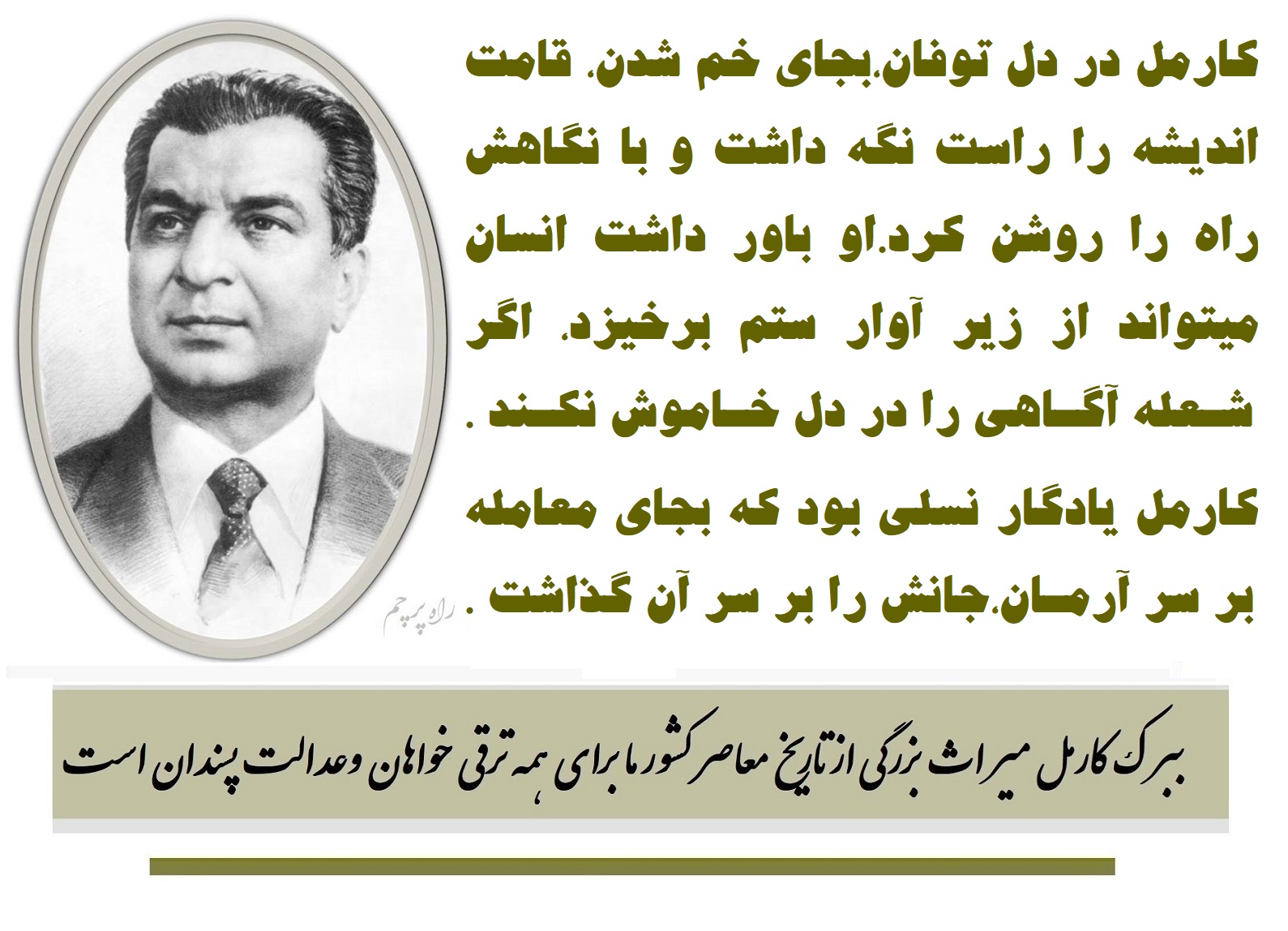 ستایش کارمل،ستایش فردی نیست،ستایش اندیشه‌ ای است که در میدان عمل آزموده شد.او در تاریخ پرزخم ما،چون فانوسی در دل تاریکی درخشید و مسیر عدالت اجتماعی را نشان داد،او بنیانگذار جنبش چپ عدالتخواهانه و نماد آگاهی طبقاتی است.